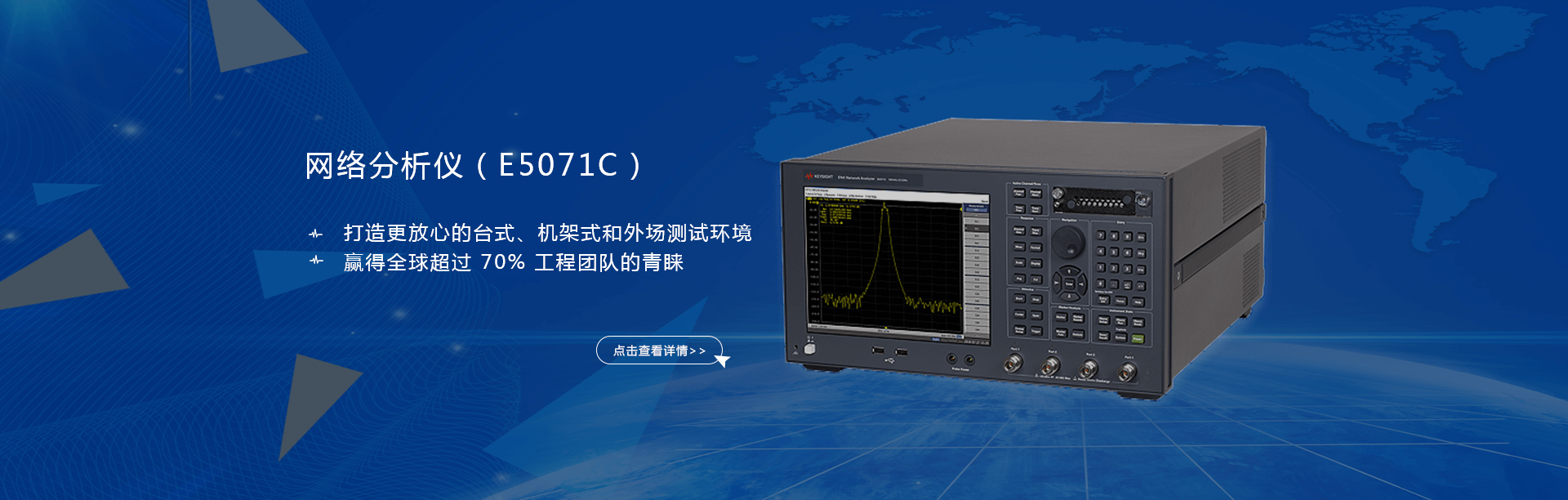 主要產(chǎn)品有:頻譜分析儀,網(wǎng)絡分析儀,綜合測試儀,藍牙wifi測試儀,噪聲系數(shù)測試儀,接收機,電話測試儀,高、低頻信號源,音、視頻信號分析儀,高精度萬用表, LCR/ 電橋、各種通信電源等。經(jīng)營的儀器品牌主要有:Keysight/Agilent (惠普 / 安捷倫)、 R/S (羅德 & 施瓦茨)、 Anritsu (安立)、Litepoint、 FLUK( 福祿克 ) 、 TEK (泰克)等。